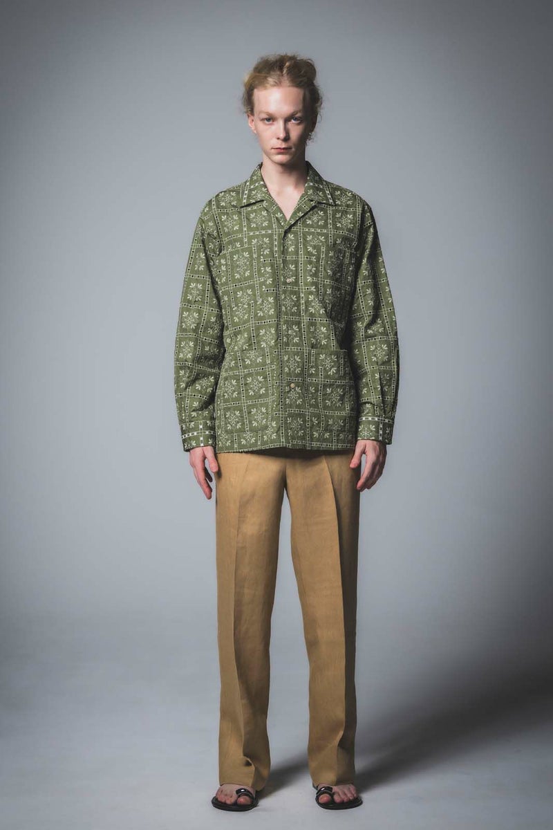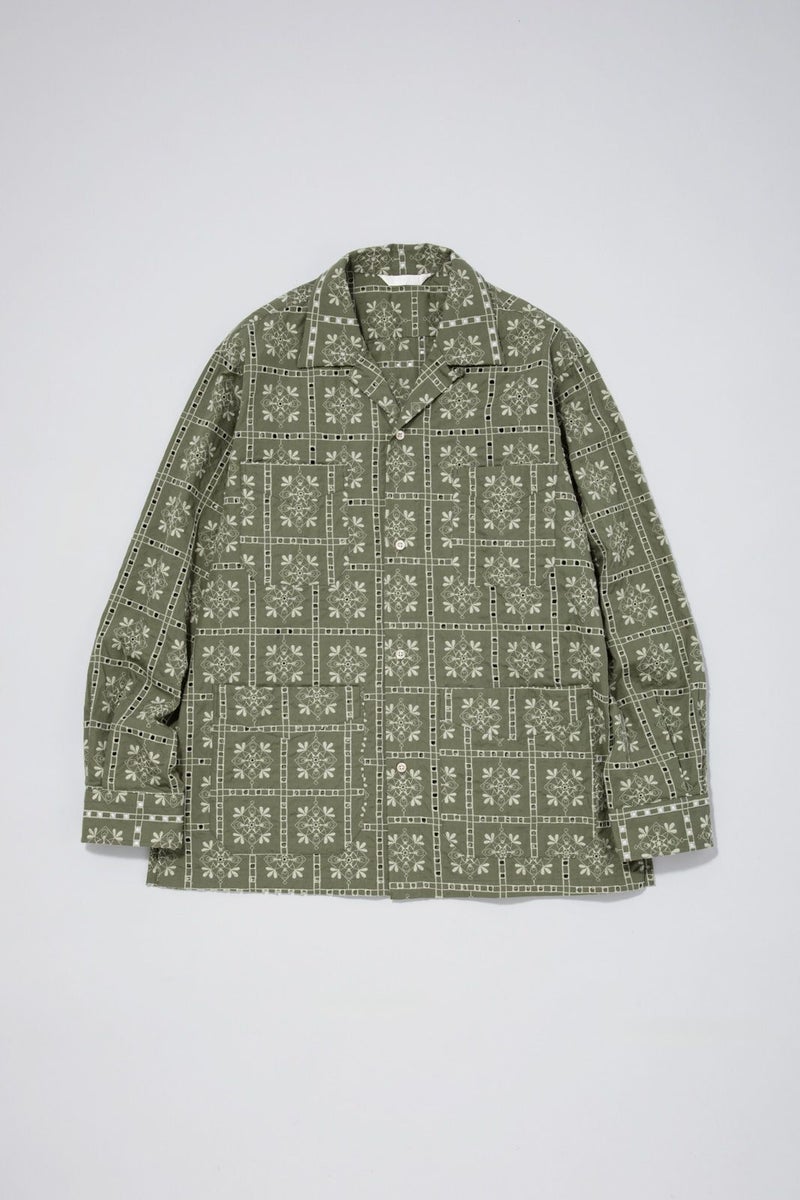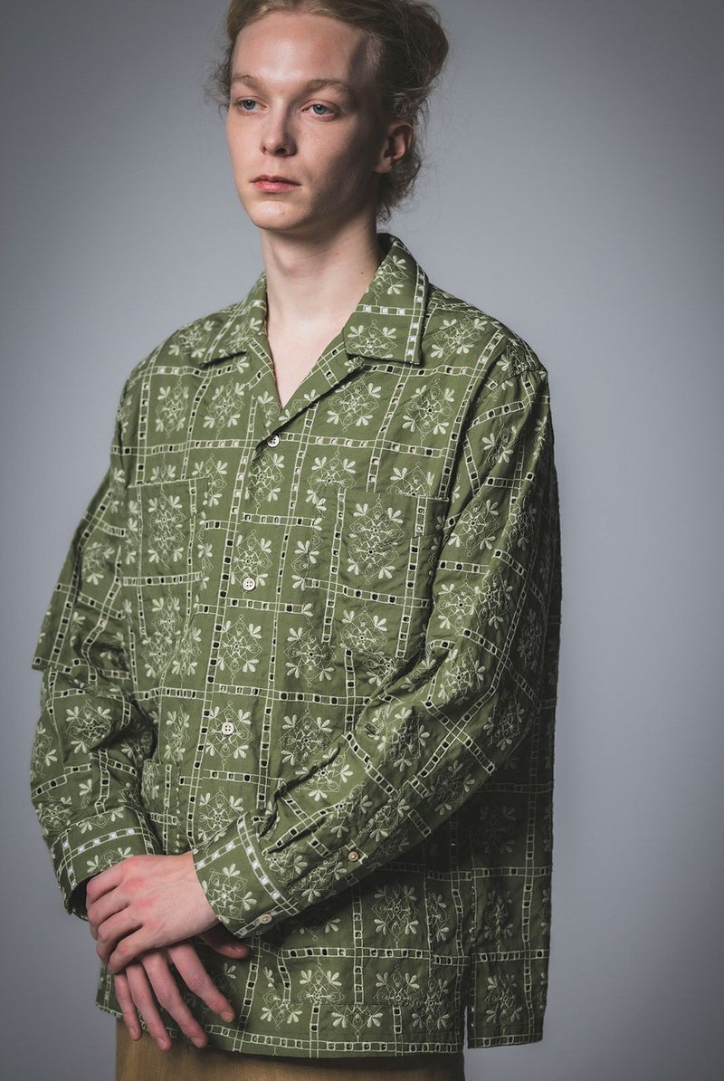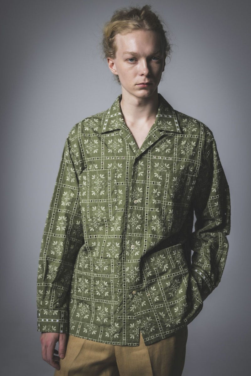 SEJOUR - FLOWER MOTIF EMBROIDERY KHAKI OPEN COLLER SHIRTS